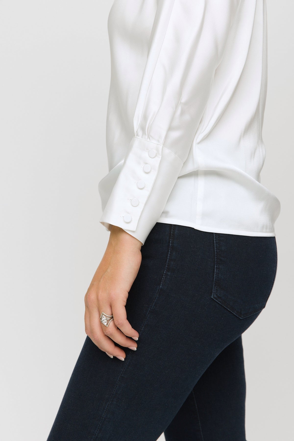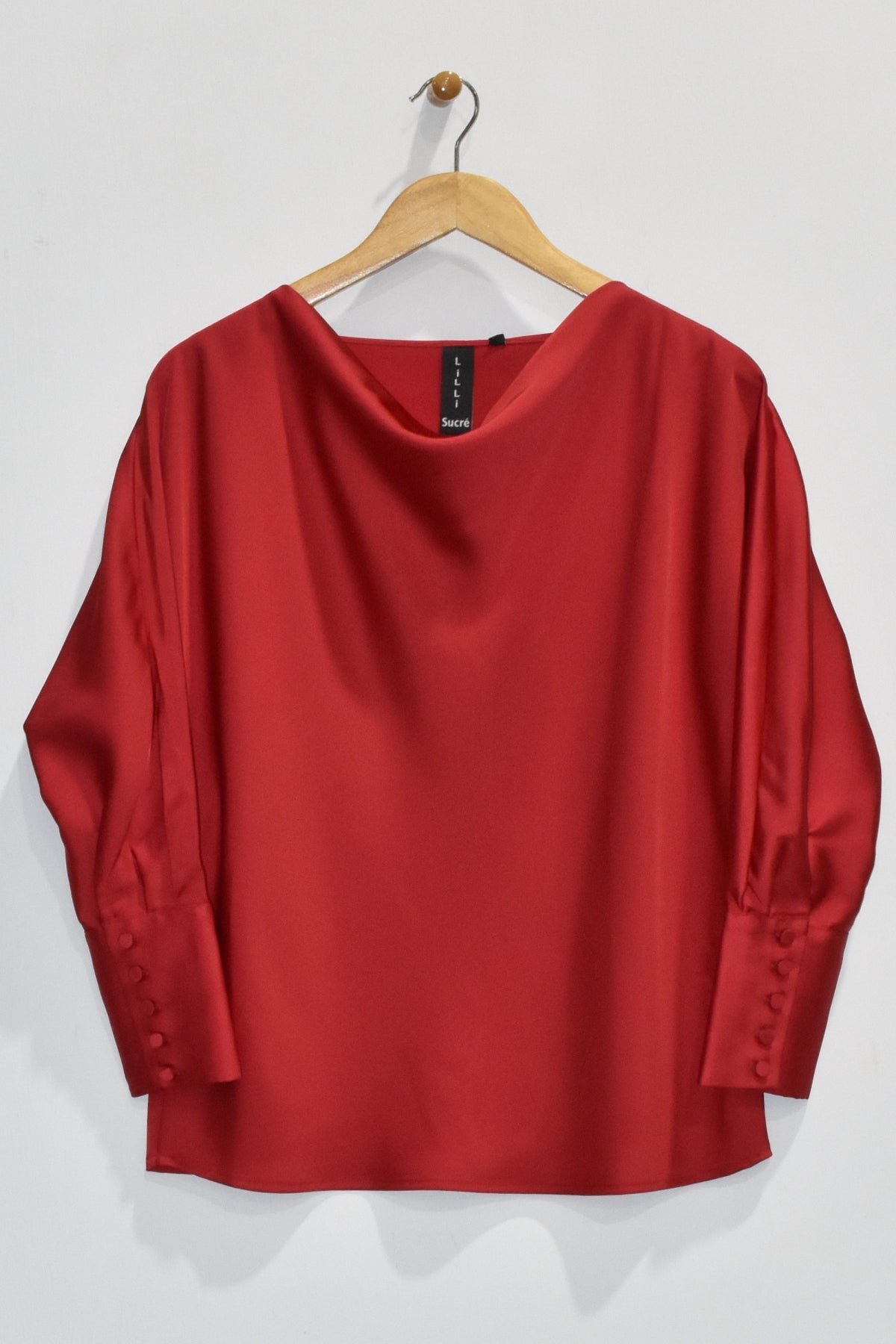 Indulge in luxury with our 26" Draped Collar Dolman Top. Made of sleek satin, this top features button cuffs and a draped collar for an elegant touch. Stay stylish and warm with its long sleeves. Elevate your wardrobe with this timeless piece.