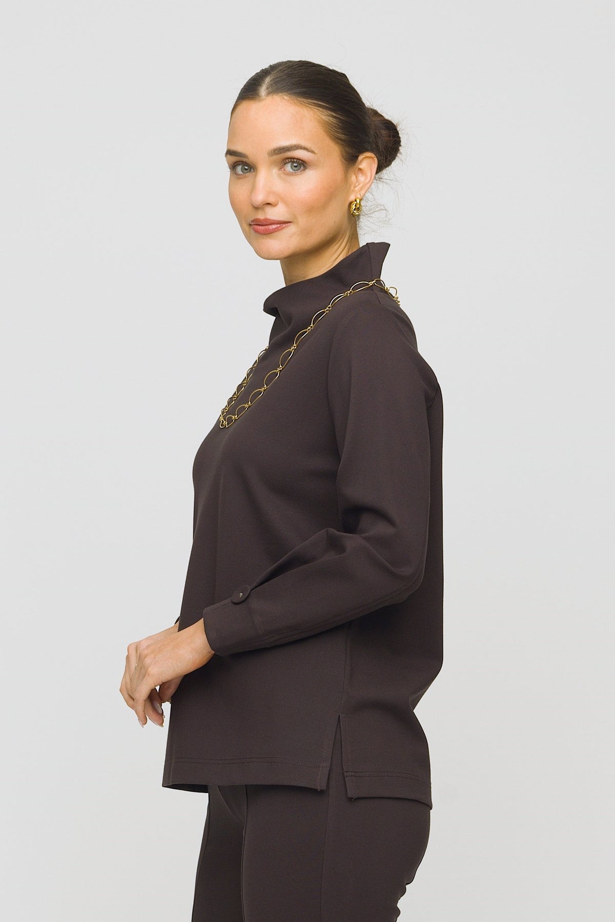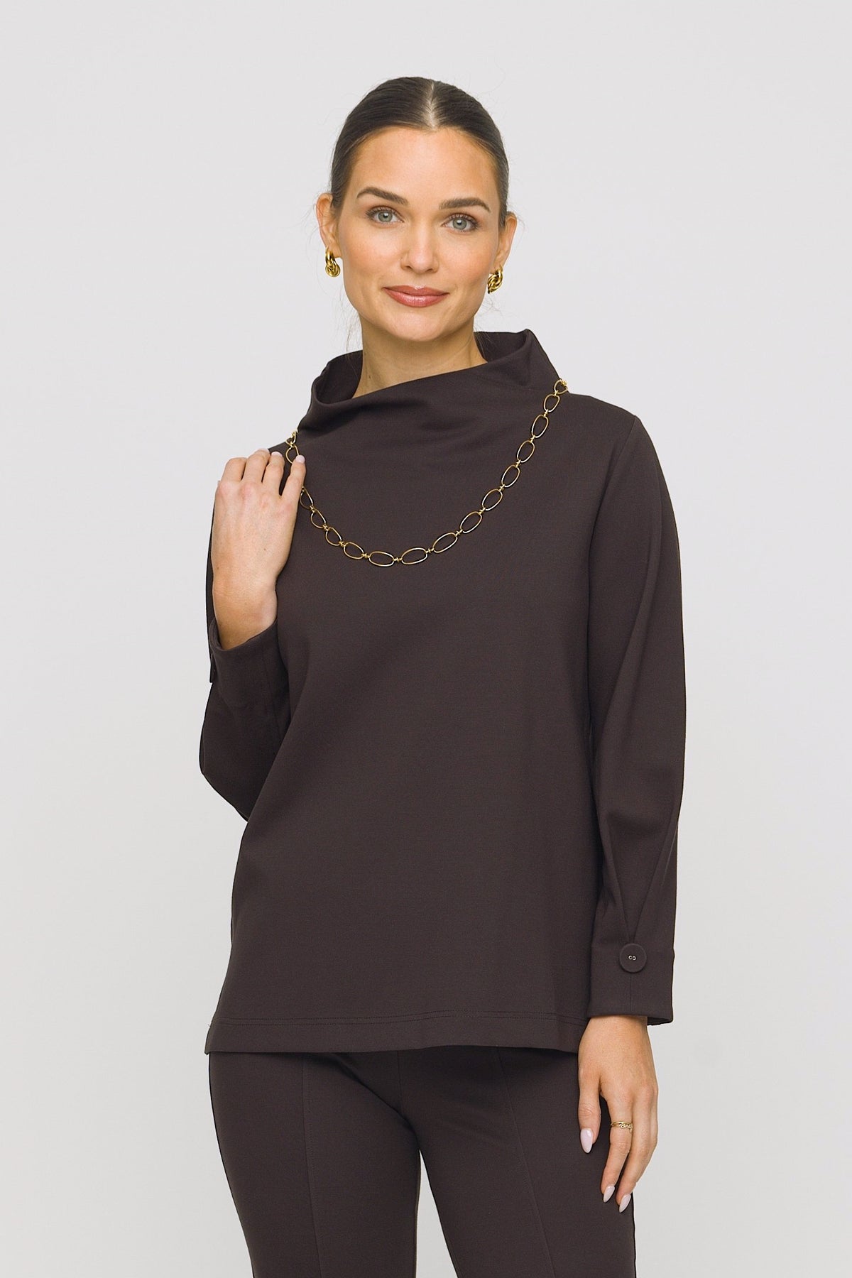 Crafted from soft ponte material, this 28" tunic features a chic funnel neck and long sleeves accented with button details. Its sleek design offers both comfort and sophistication, making it an essential piece for a polished, modern wardrobe.