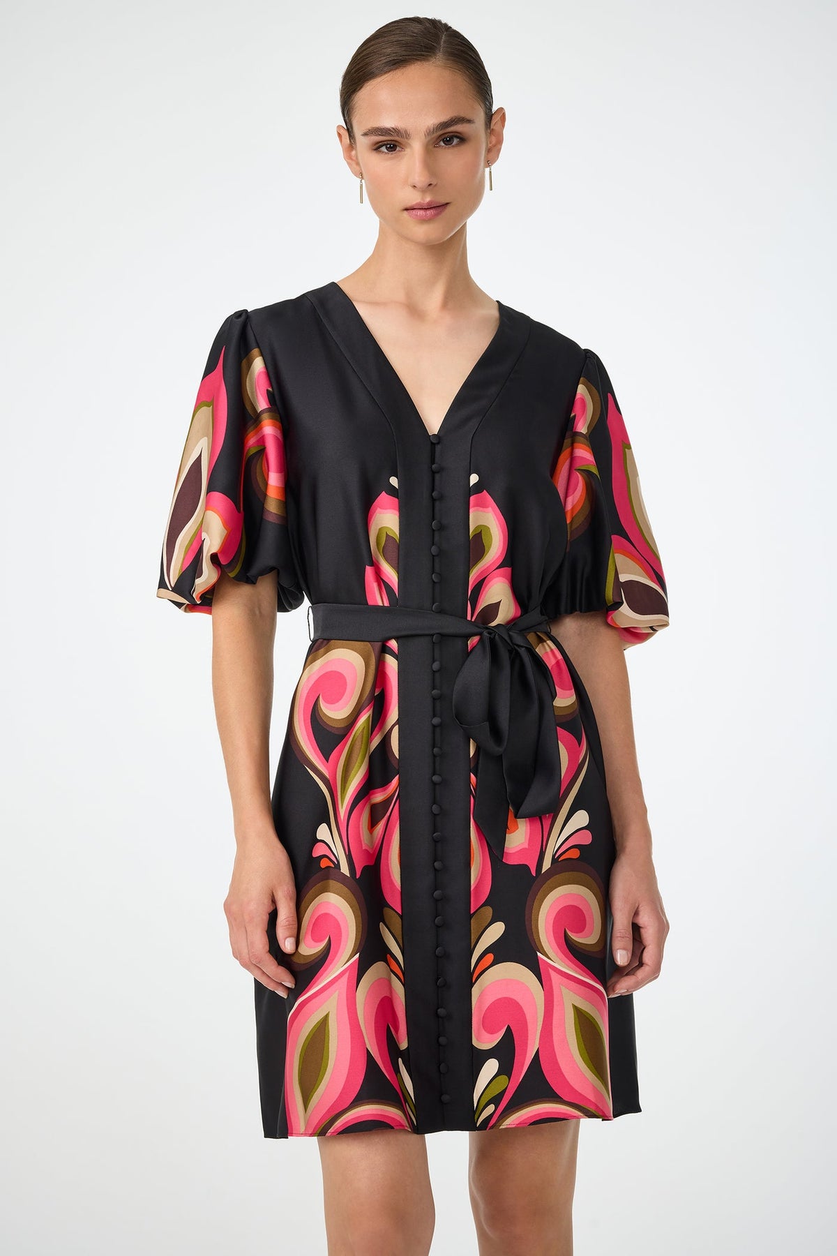 This mini dress will become one of your favorite key looks in your wardrobe. Featuring a V-neck, functional buttons and loops at the center front, and a removable sash, this beautifully detailed dress has an effortlessly chic shape and style that makes a statement. This dress is made of drapey satin georgette in an eye-catching print.