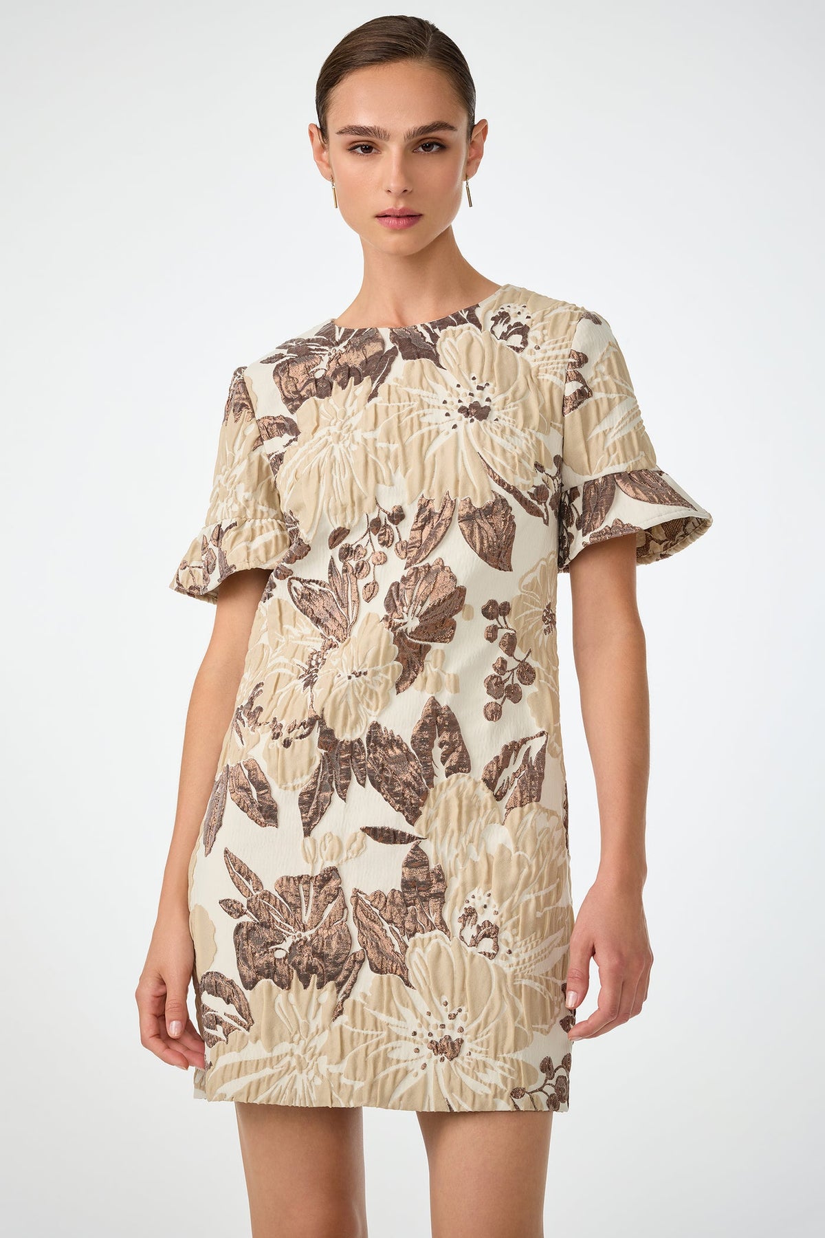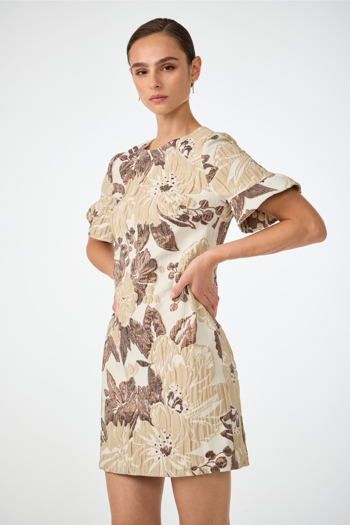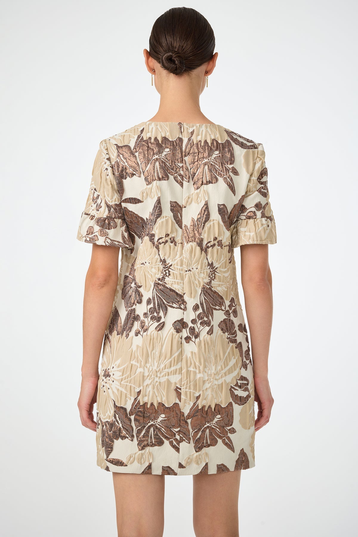 Meet your date for your next cocktail party or wedding. Featuring a feminine mini length with short bell sleeves, this dress is dazzling in detailed, neutral textured jacquard with gold Lurex woven in and a lightweight feel.