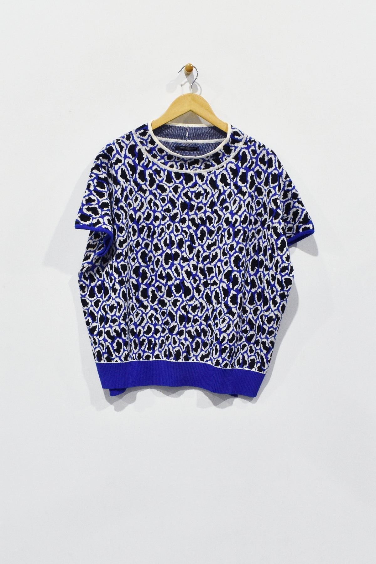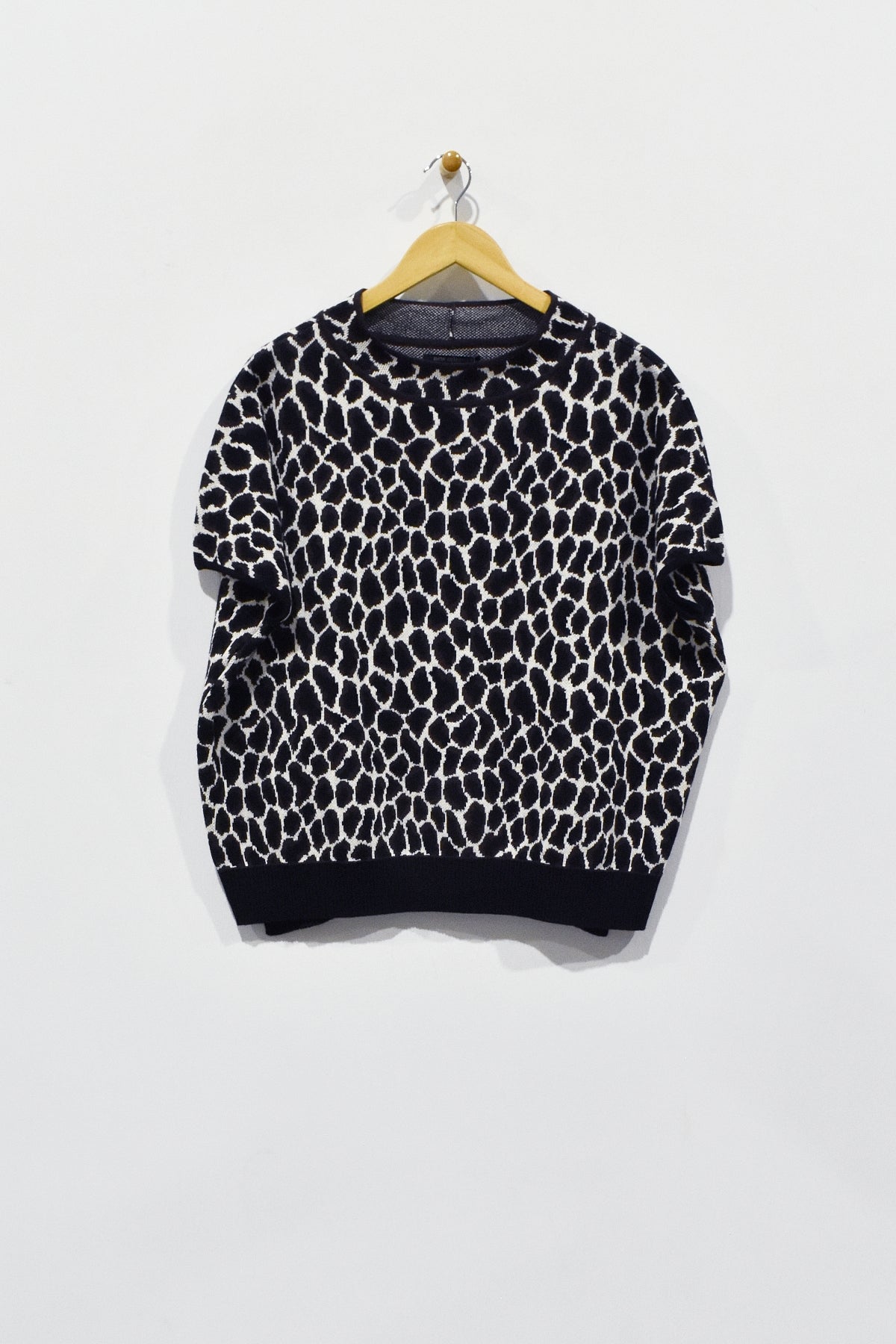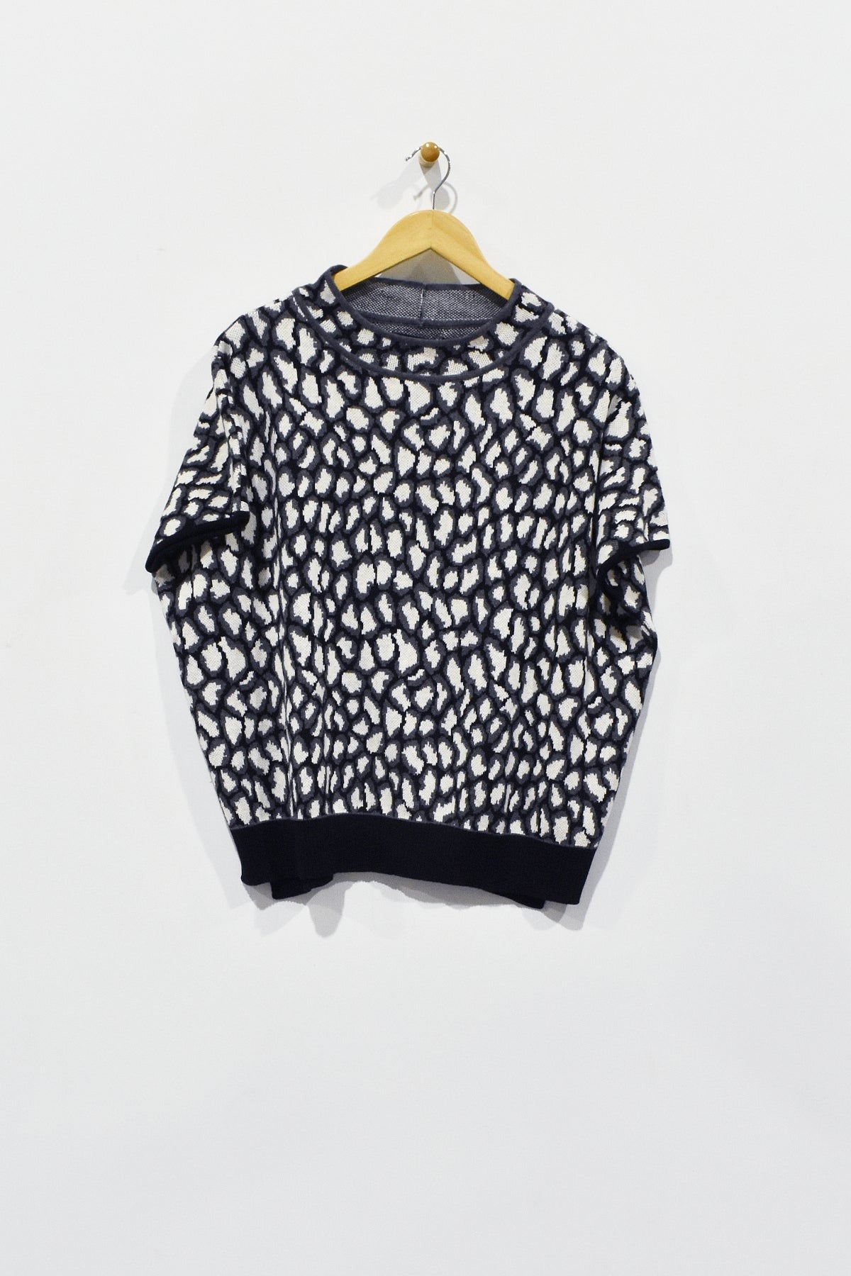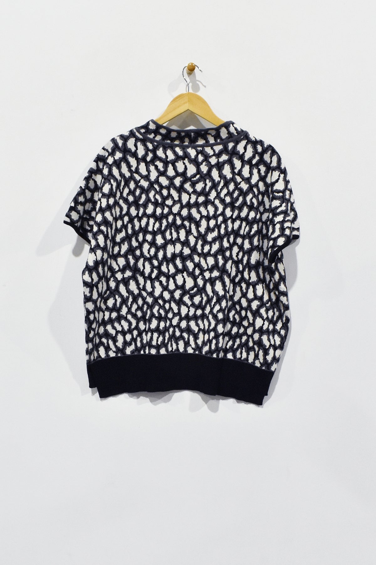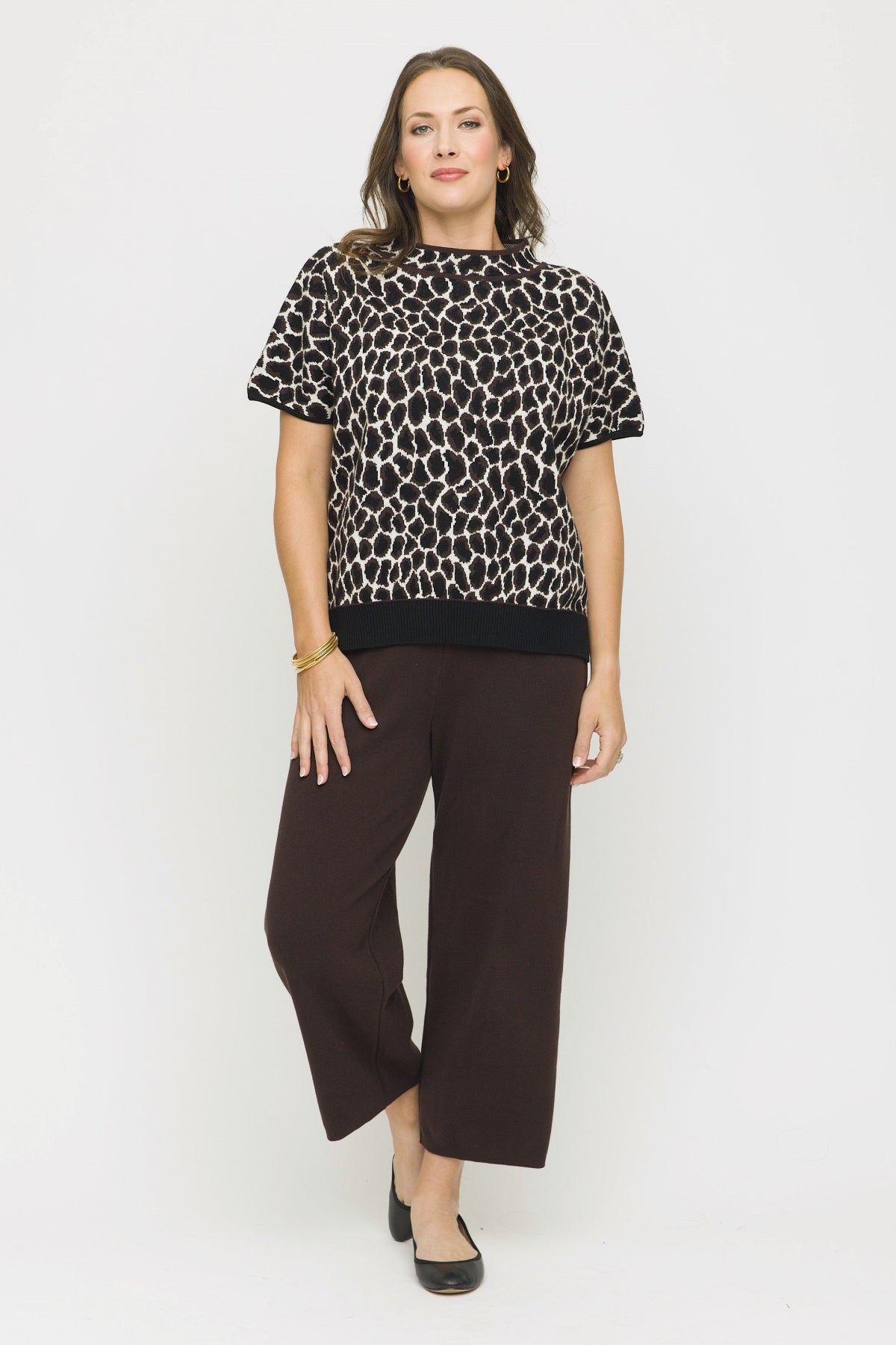 This 25" mock neck boxy top is expertly crafted in Peru from a leopard print knit fabric, combining quality craftsmanship with bold design. Featuring short sleeves for comfort and a contrast hem for a polished edge, this top offers a sophisticated yet striking addition to any wardrobe.