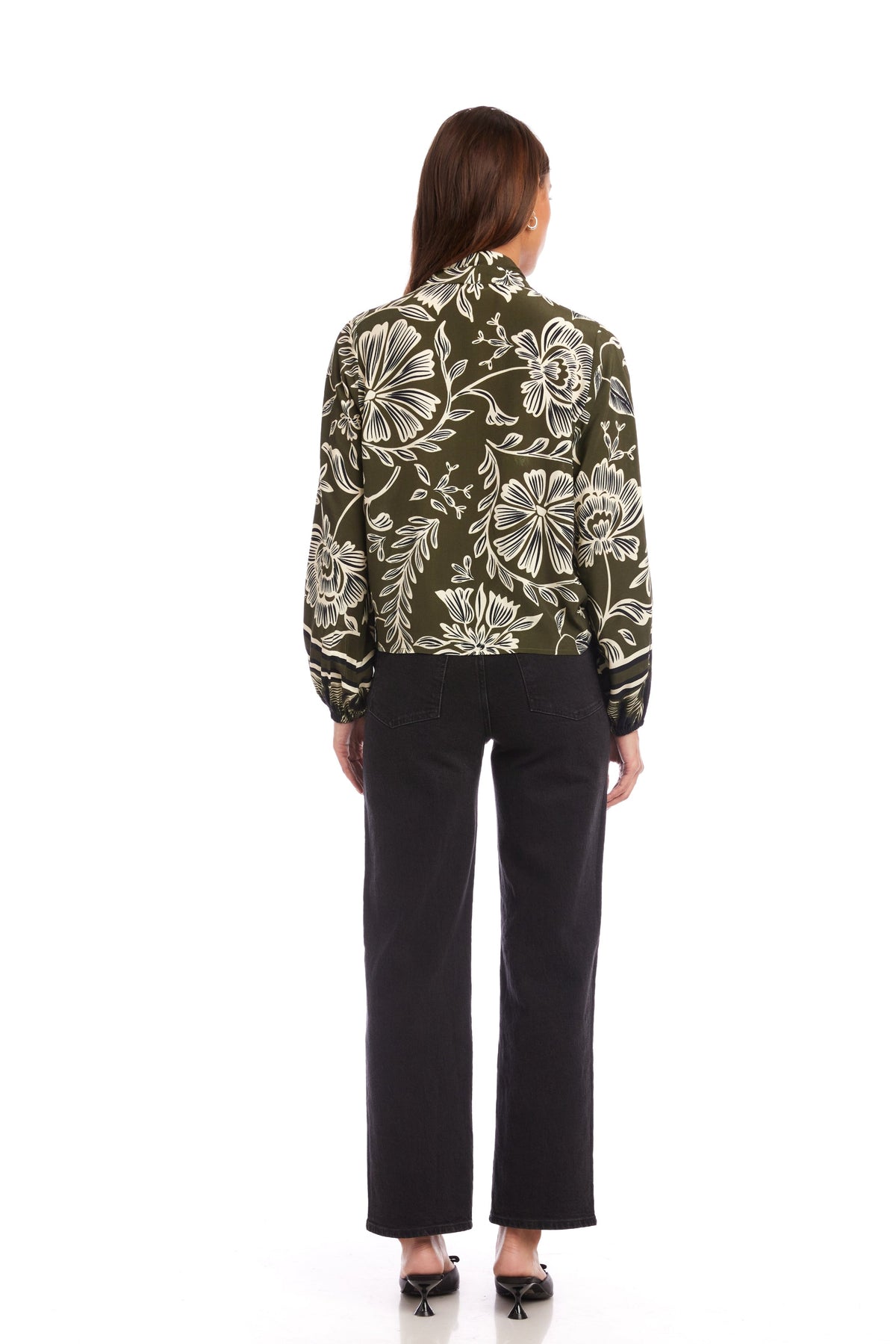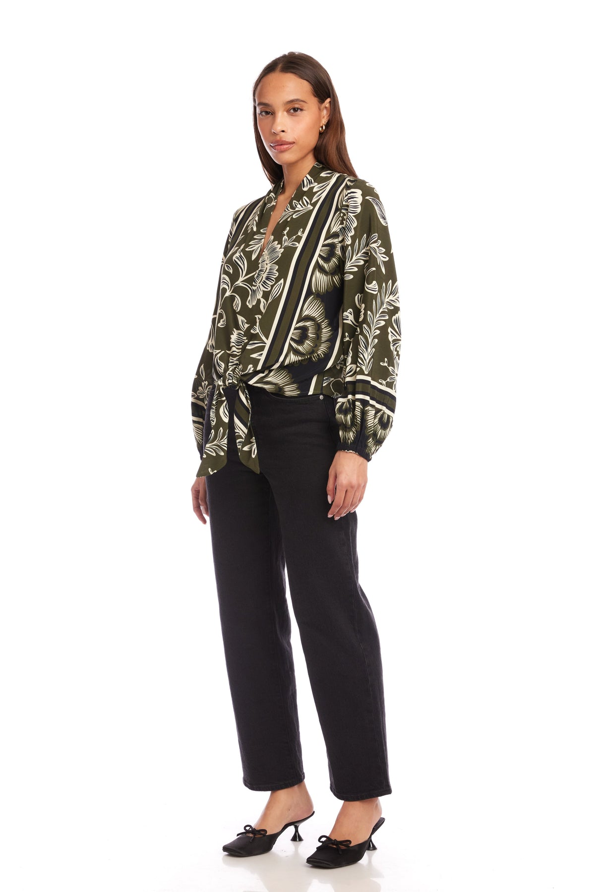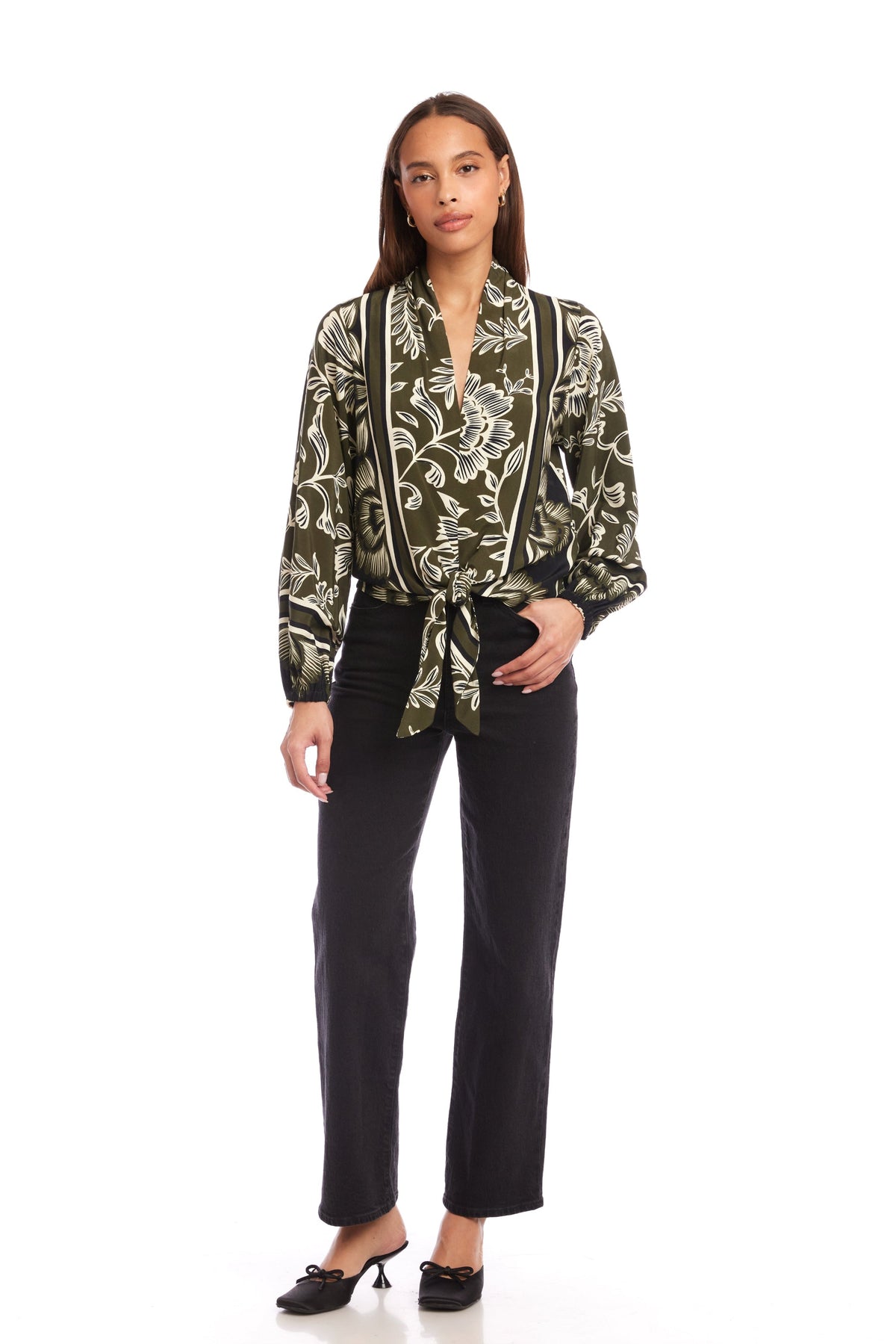This olive-colored Scarlet Top showcases a floral border crepe pattern, features long sleeves, and includes a front tie detail that sits at the waist for a flattering silhouette.
