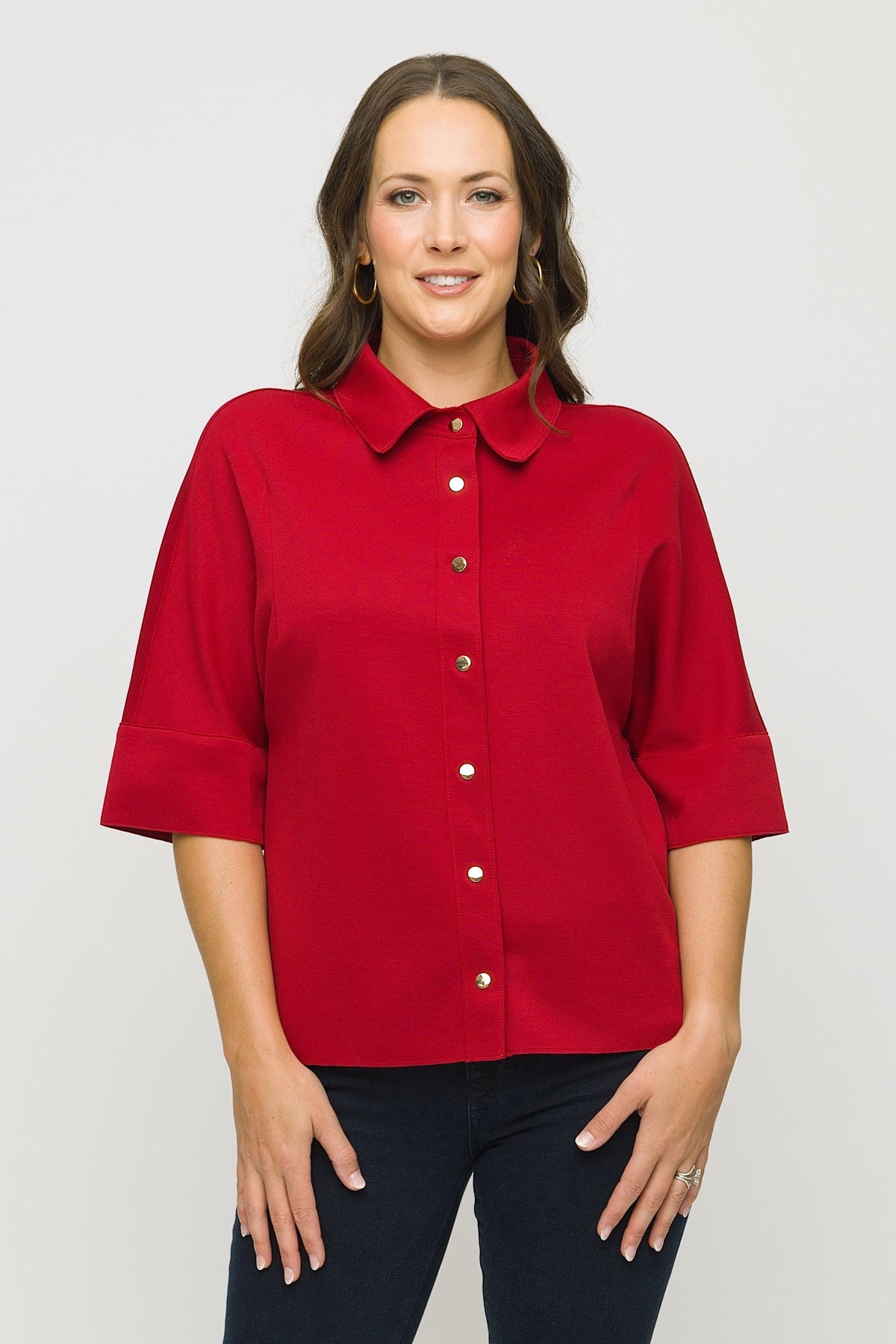 Elevate your wardrobe with the 27" Elbow Sleeve Scuba Shirt, featuring a refined Johnny collar accented by elegant snap buttons. Crafted from premium scuba material, it offers a smooth, structured fit that contours gracefully. The elbow-length sleeves provide a balanced silhouette, combining comfort with understated sophistication for a timeless, polished look.