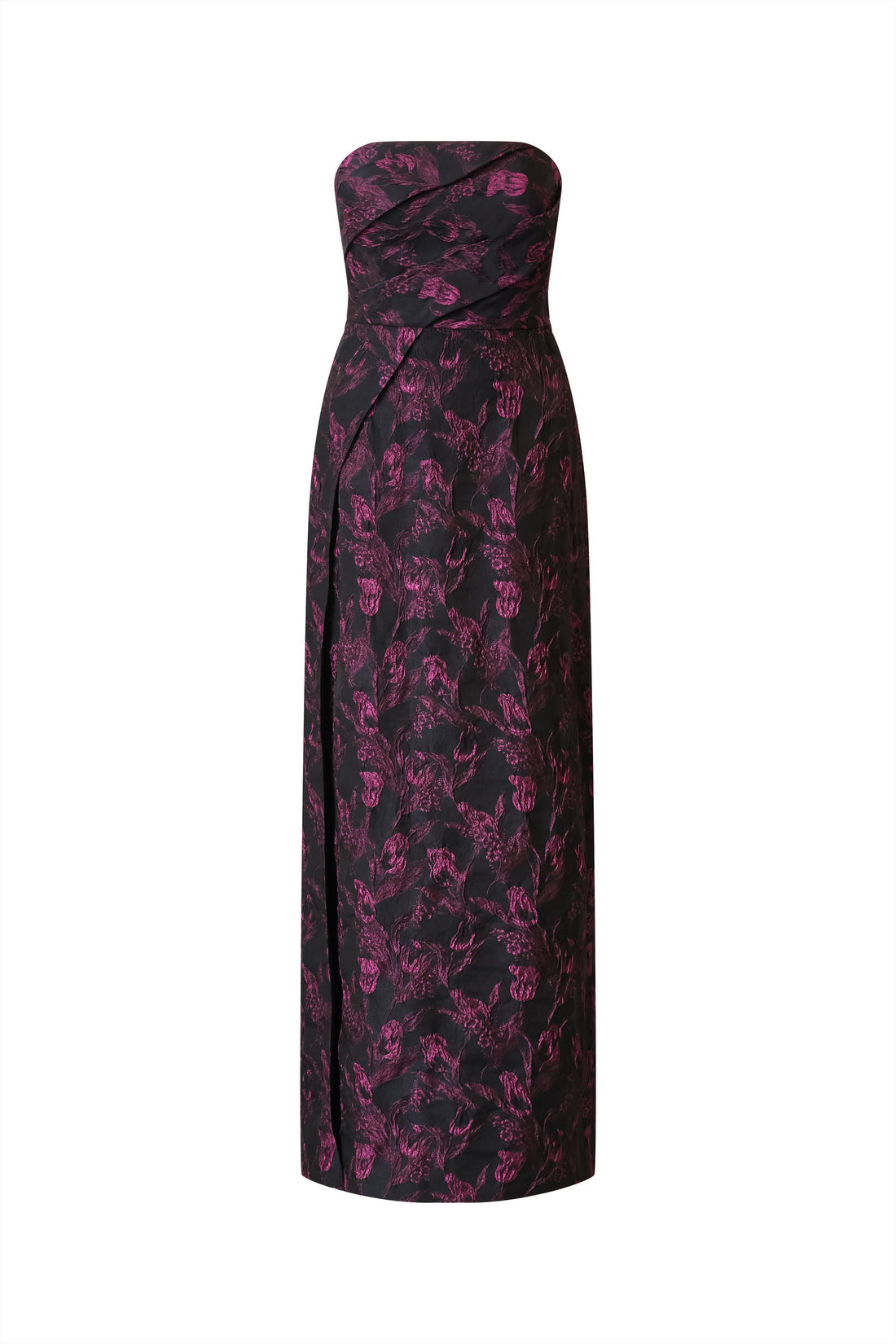 Textured tulip jacquard gown with soft pleating across the bodice and a fluid overskirt detail. Finished with a column silhouette and a seamed-in train for added drama. A romantic choice for galas, winter weddings, and black-tie celebrations.