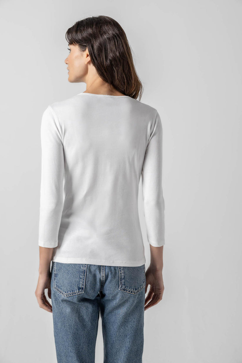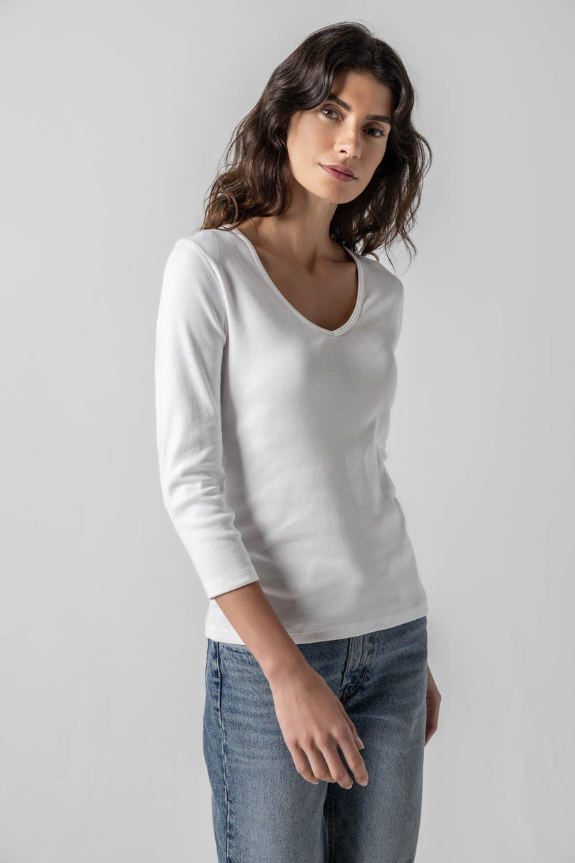 In a slightly heavier weight 1x1 rib fabric and a fit that is closer to the body, our 3/4 sleeve v-neck tee is truly versatile. The neckline offers a feminine look and continues to be a favorite!
