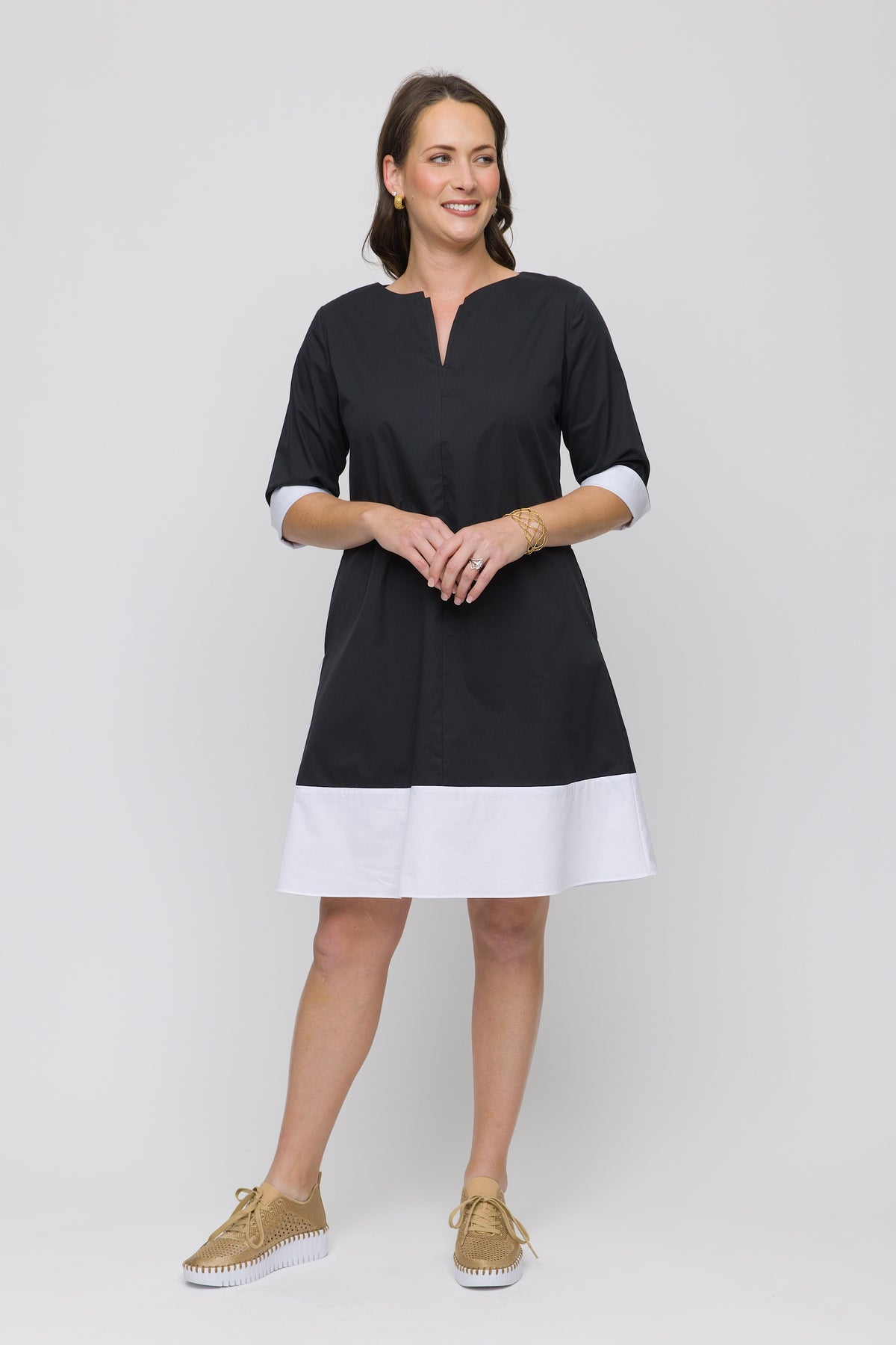 Effortlessly chic and ready for anything, this 37" dress features a flattering A-line silhouette that moves with you. The lightweight fabric keeps you cool and comfortable all day long, while the ¾ sleeves and V-neck create a polished, versatile look. Best part? Functional pockets mean you can finally ditch the bag. The wide hem adds a touch of modern flair to this wardrobe essential.