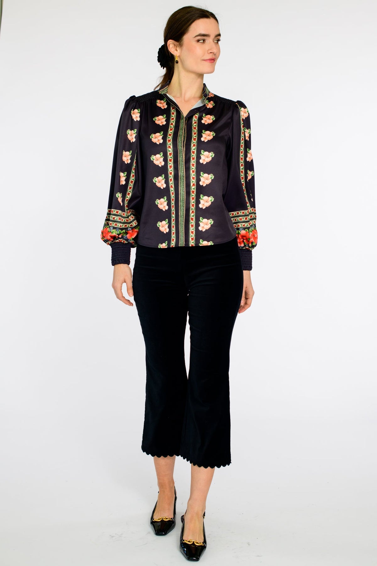 The Emily Top is the perfect button front blouse, featuring a mandarin collar, covered placket, and balloon sleeves. This season, she is cut from a soft satin fabric in our Garland Stripe print, great for dressing up or down this season.