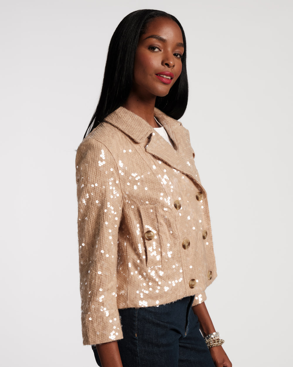 Meet the Sequin Moto Jacket, your instant wardrobe upgrade. Champagne-colored sequins cover every inch, catching the light from every angle for that disco-ball glow. Structured yet playful, the double-breasted silhouette can be buttoned for extra polish or left open for a relaxed, party-ready vibe.